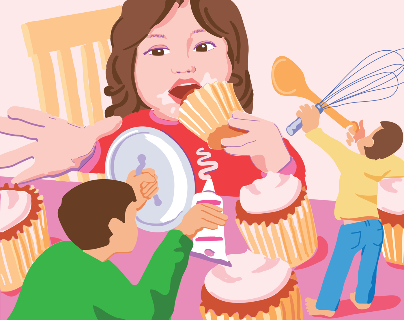 Illustration for a birthday card. Inside message reads: "Valiant knights of the realm have taken oath to protect your birthday cupcakes from the one who seeks to devour!"